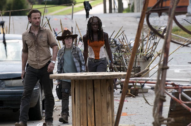 For the most part the costumes are kept in neutrals and faded, but every now and then we get pops of colors for certain characters. Maggie started out in soft pinks, and florals, and has transitioned to dark colors. Andrea often wears blue, and Beth favors soft pastels. Carol and Michonne wear the most color, staying mostly in the pink, rust, orange, and red families. Daryl wears leather and is a general bad ass! LOVE HIM!!
